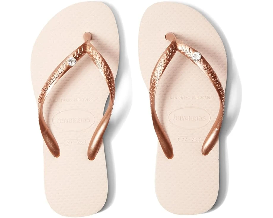 Give speed and comfort to your little child for indoor and outdoor activities getting Havaianas® Kids Slim Crystal SW II Flip Flop Sandal (Toddler/Little Kid/Big Kid) footwear.SKU: #9736395Synthetic upper.Synthetic lining and insole.Toe-post closure.Sleek straps.Crystal accent.Rubber outsole.Made in Brazil.Product measurements were taken using size 27-28 (US 11-12 Little Kid), width M. Please note that measurements may vary by size.Weight of footwear is based on a single item, not a pair.Measurements: