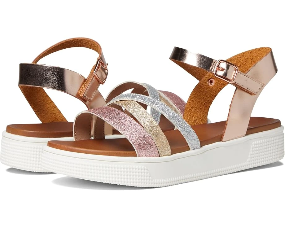 Featuring glittered and metallic toe strap and crisscross vamp straps, the MIA® Kids Footwear Moriah sandals look chic and feel comfy with their cushioned insoles.SKU: #9738548Man-made upper, lining, and insole.Ankle strap with buckle and hook-and-loop closure.Open round toe.Elevated flat silhouette.Branding detail on the footbed.Man-made outsole.Imported.Measurements: