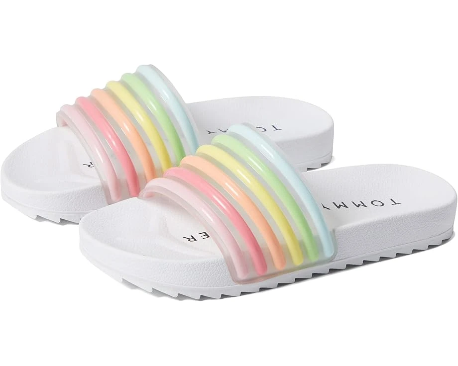 Let your kid stroll around in a chic style by wearing the Tommy Hilfiger® Kids Shylo sandals. SKU: #9673919Synthetic upper with colorful rainbow stripes detailing. Synthetic lining. Open round toe silhouette. Easy slip-on style. Durable synthetic outsole. Imported. Product measurements were taken using size 11 Little Kid, width M. Please note that measurements may vary by size.Measurements: